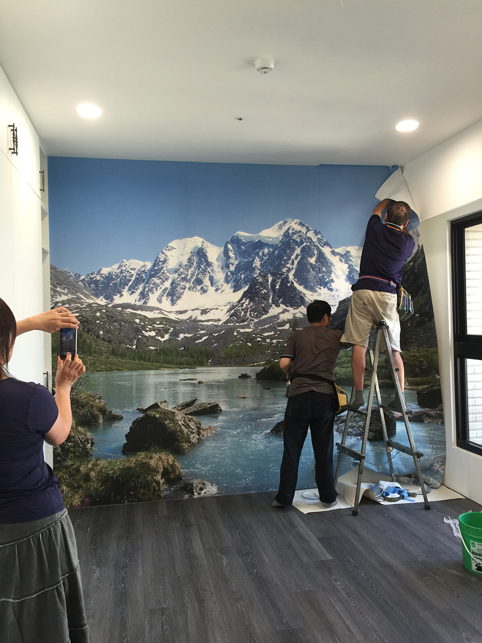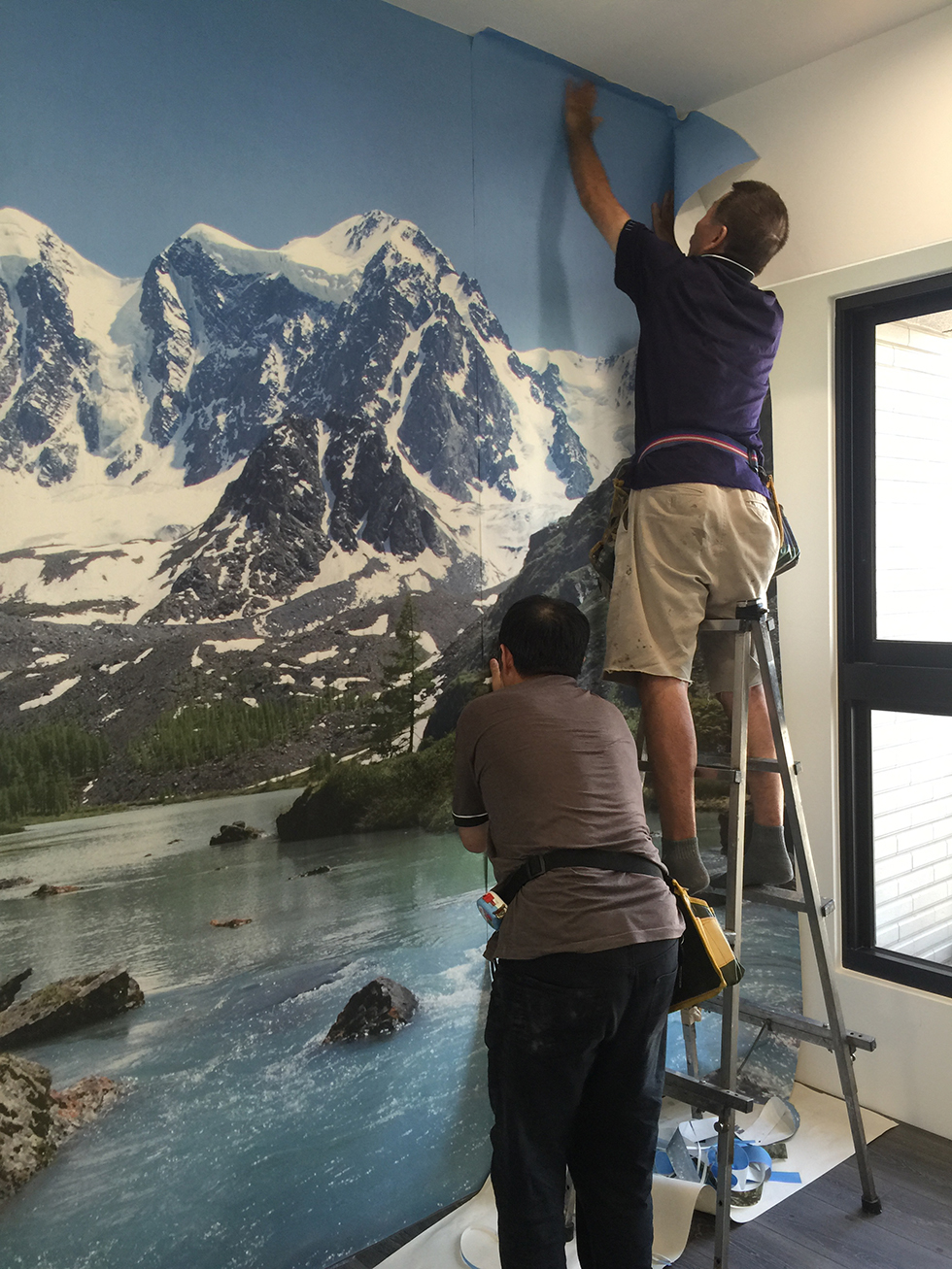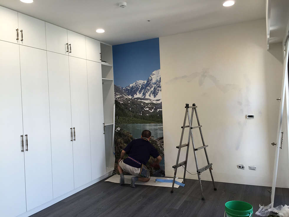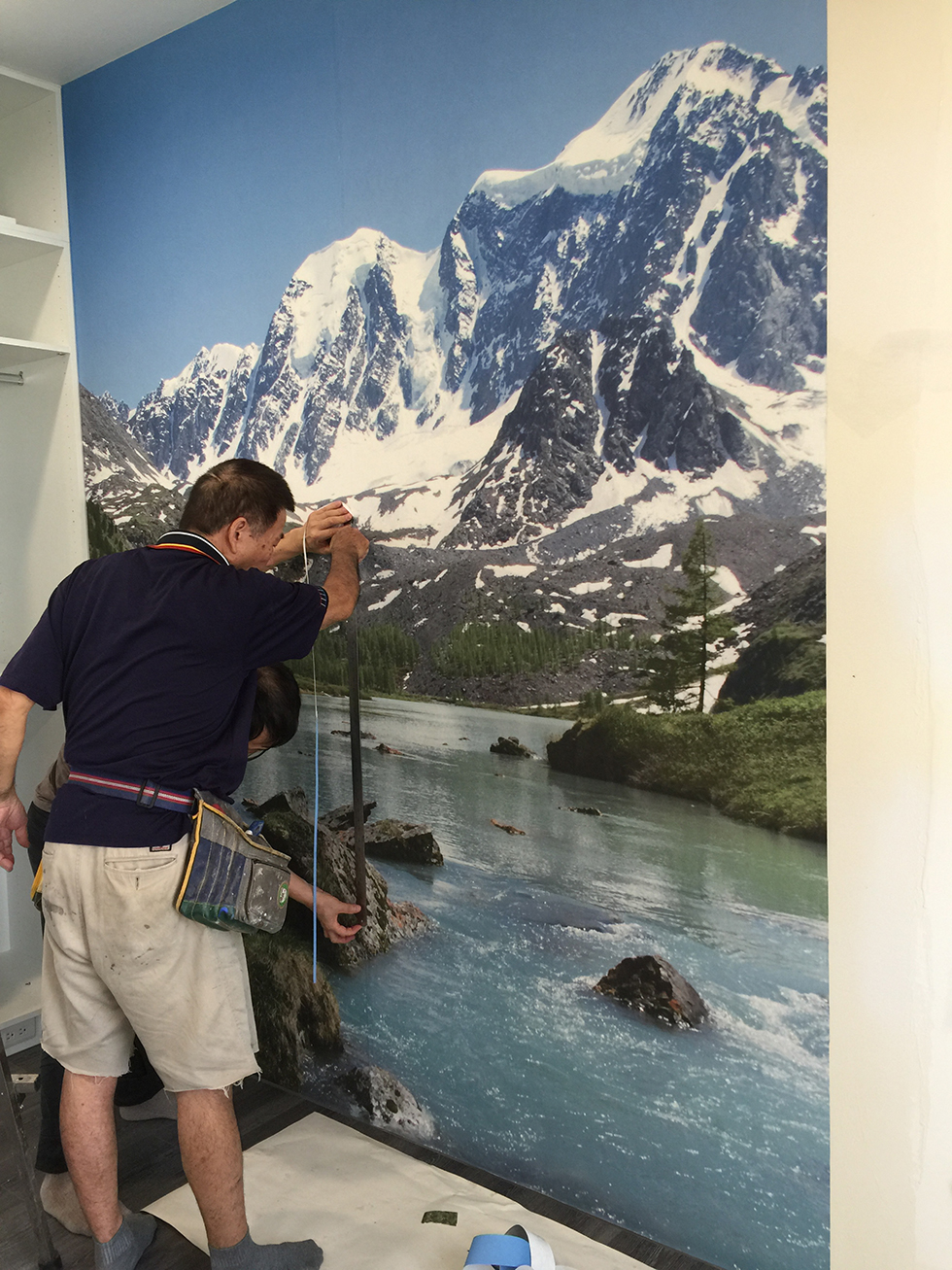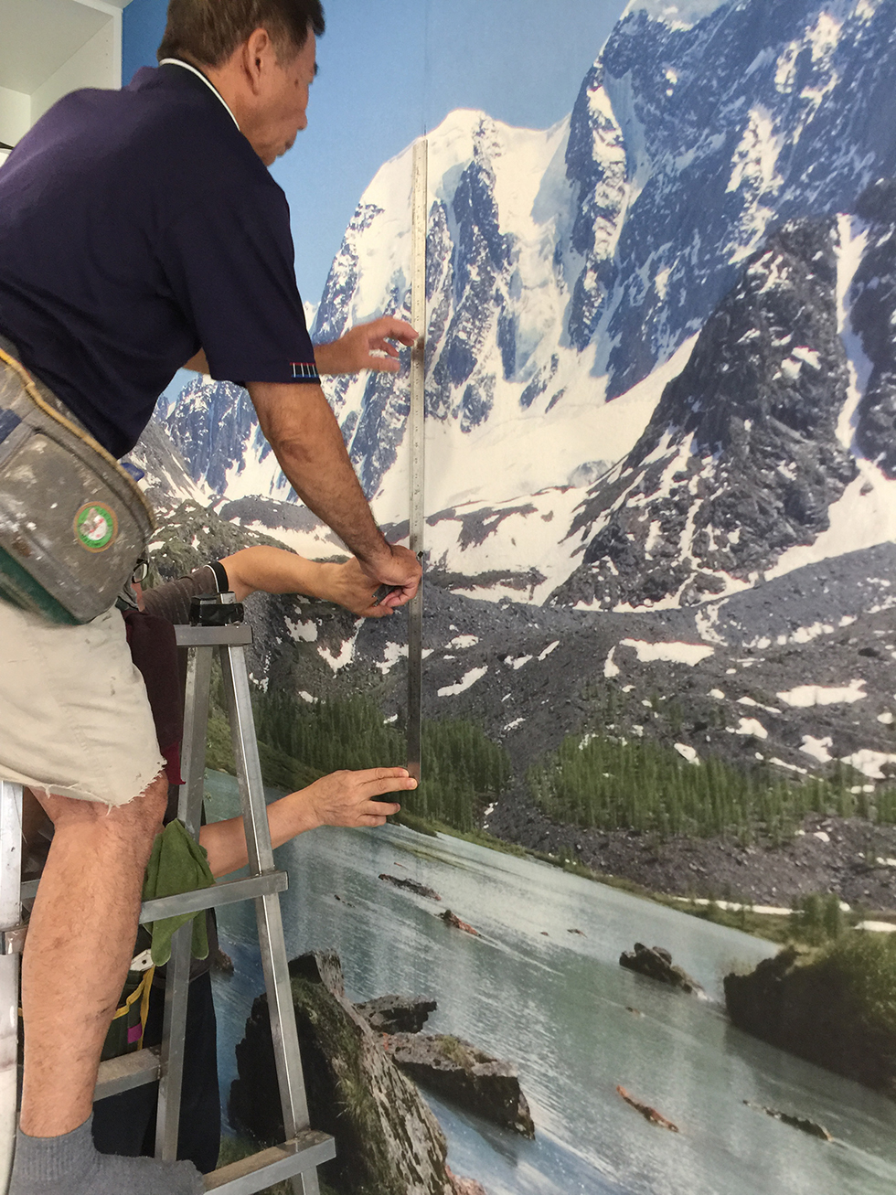 張貼天花板邊緣與轉角,是考驗師傅功力的時候